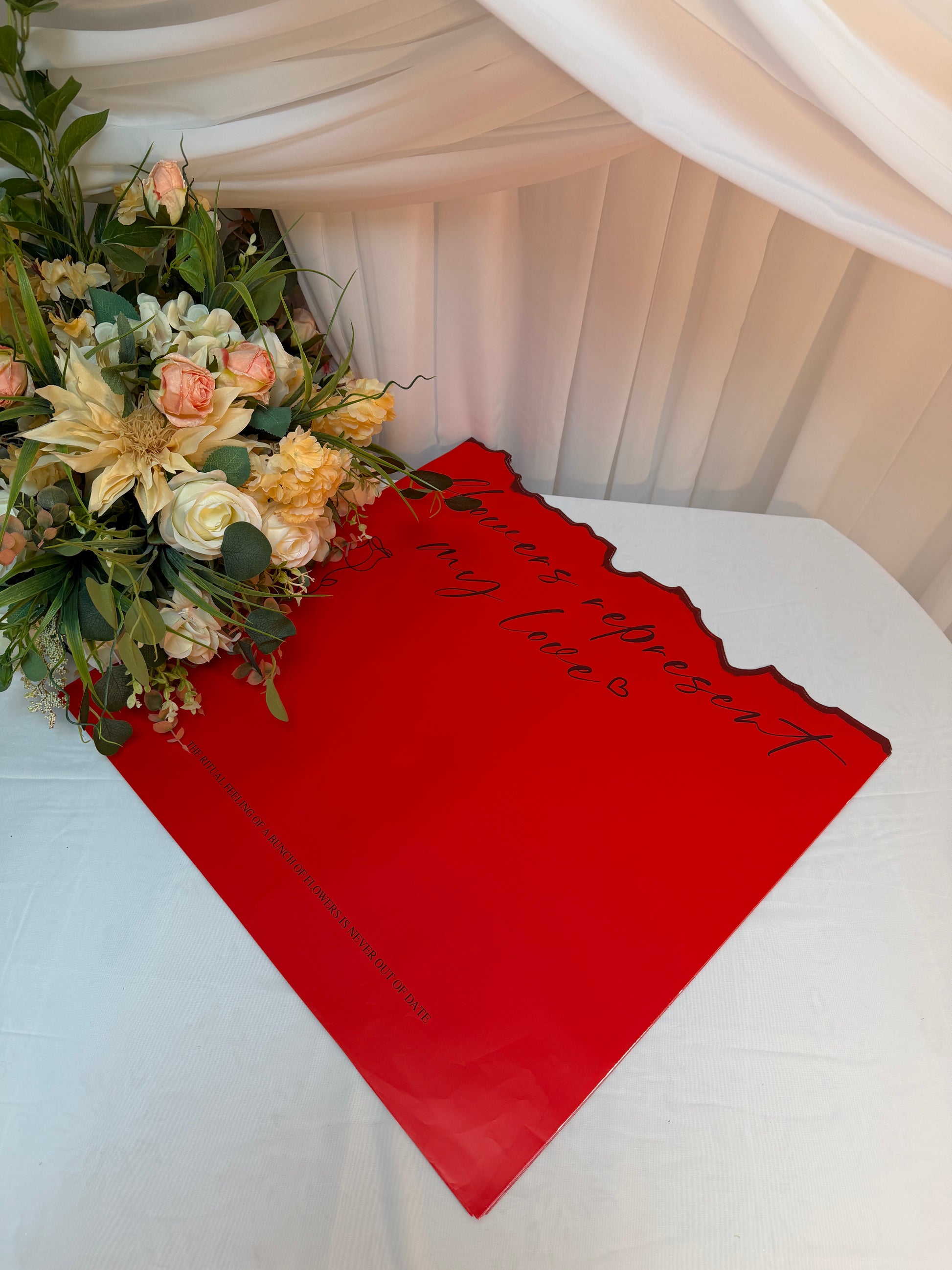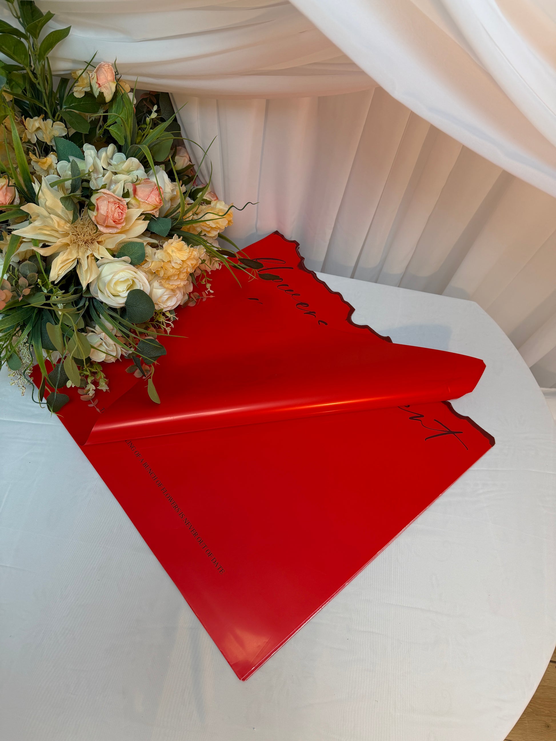 Cu dimensiunea generoasă de 57 × 55 cm, ambalajul este ideal pentru buchete medii și mari, aranjamente florale, flori decorative sau compoziții florale pentru evenimente speciale. Culoarea roșie intensă adaugă un accent vibrant și elegant, fiind perfectă pentru ocazii festive, sărbători, aniversări sau evenimente romantice.