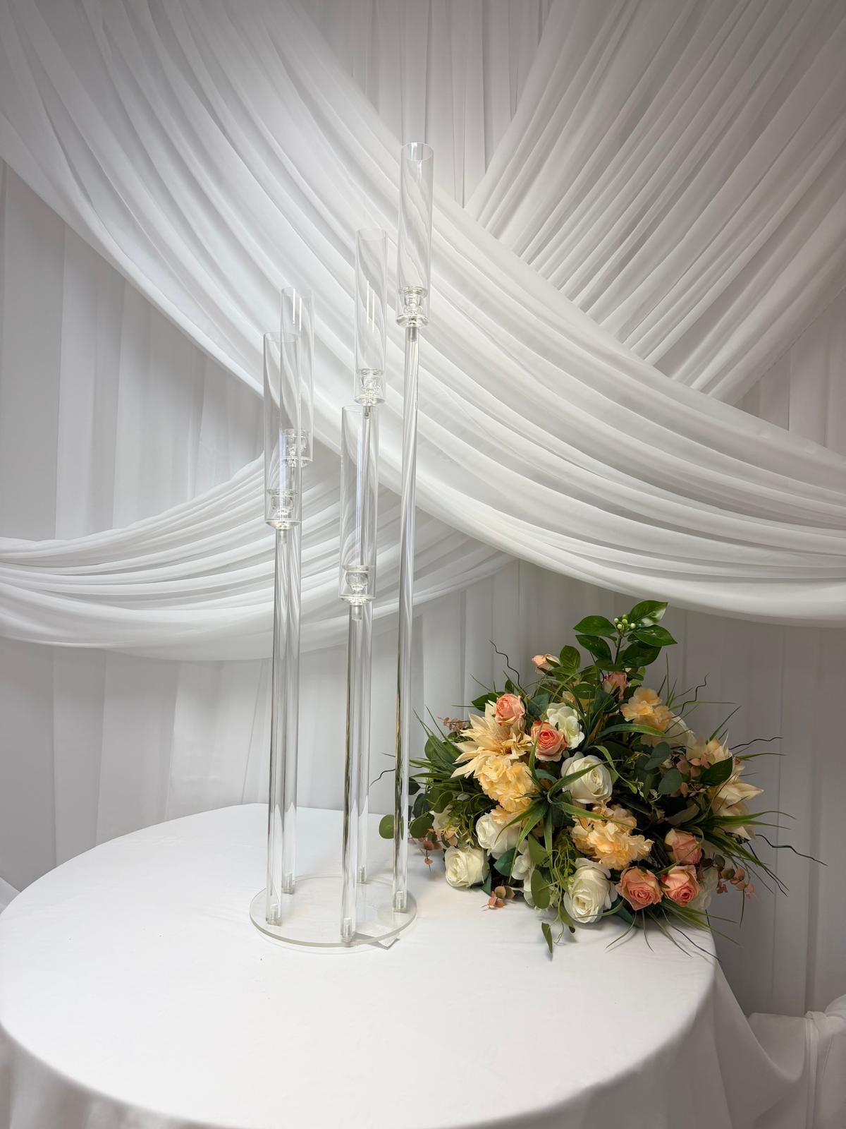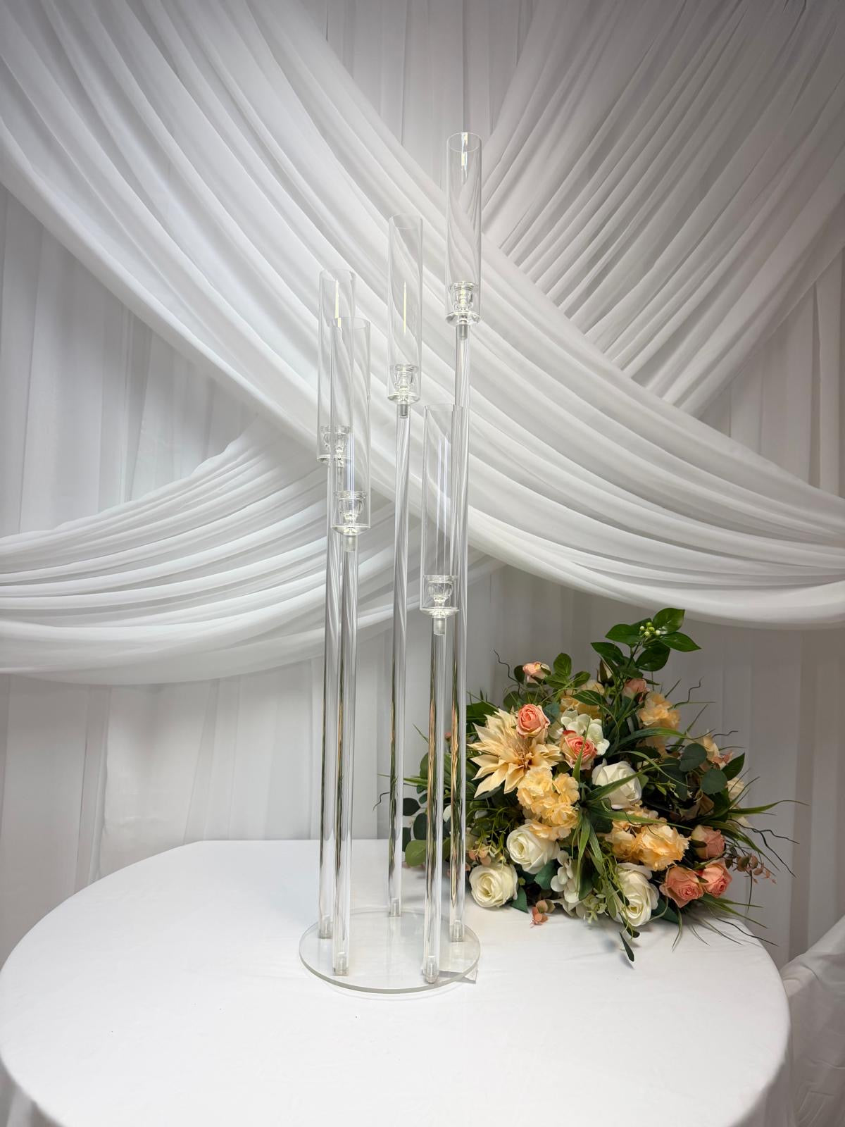 Transformă orice eveniment sau spațiu cu acest suport decorativ modern, realizat din acril transparent de înaltă calitate. Designul său elegant, compus din 5 tuburi verticale montate pe o bază rotundă, creează un efect vizual spectaculos, ideal pentru decoruri florale sau lumânări subțiri.