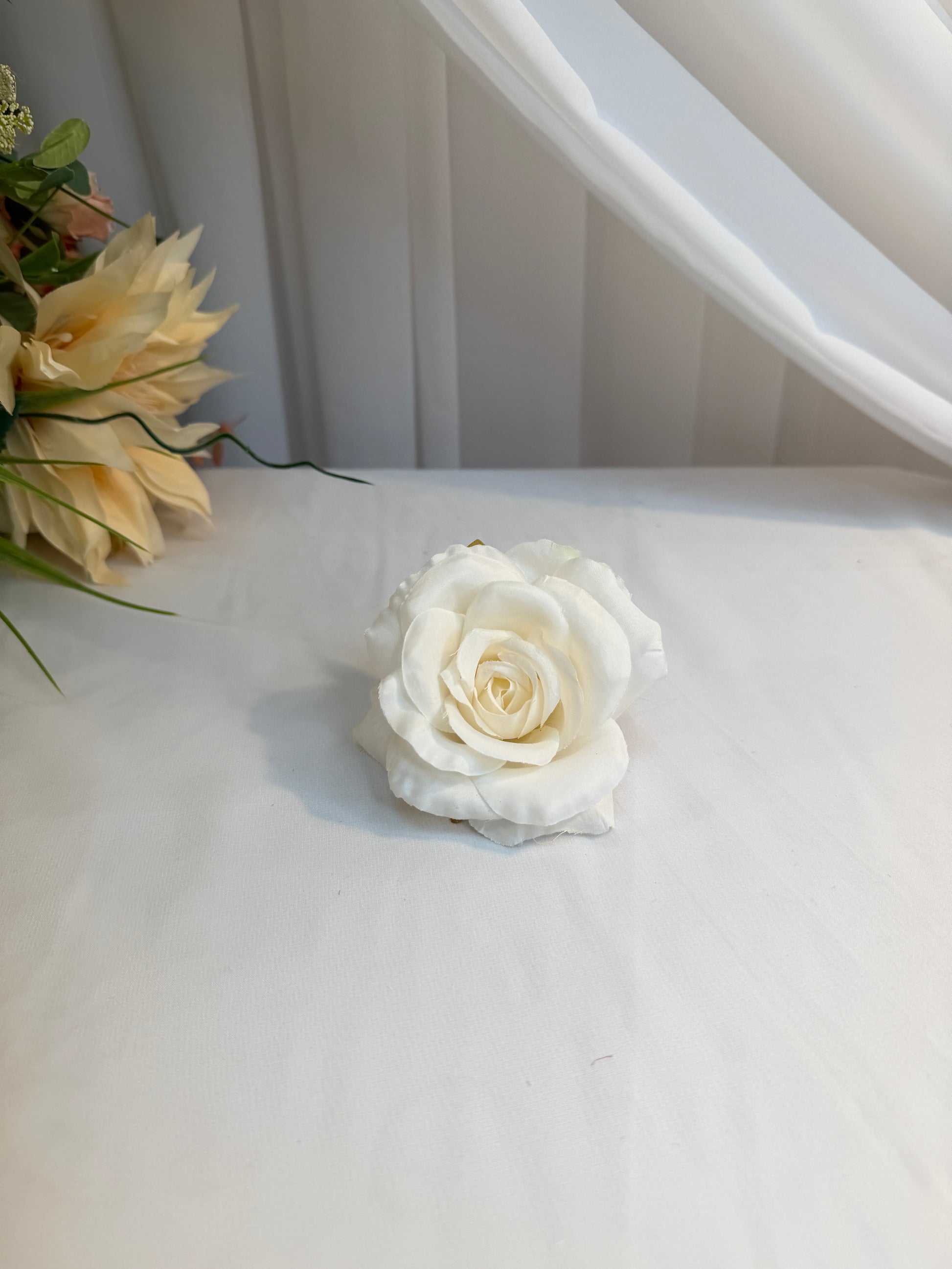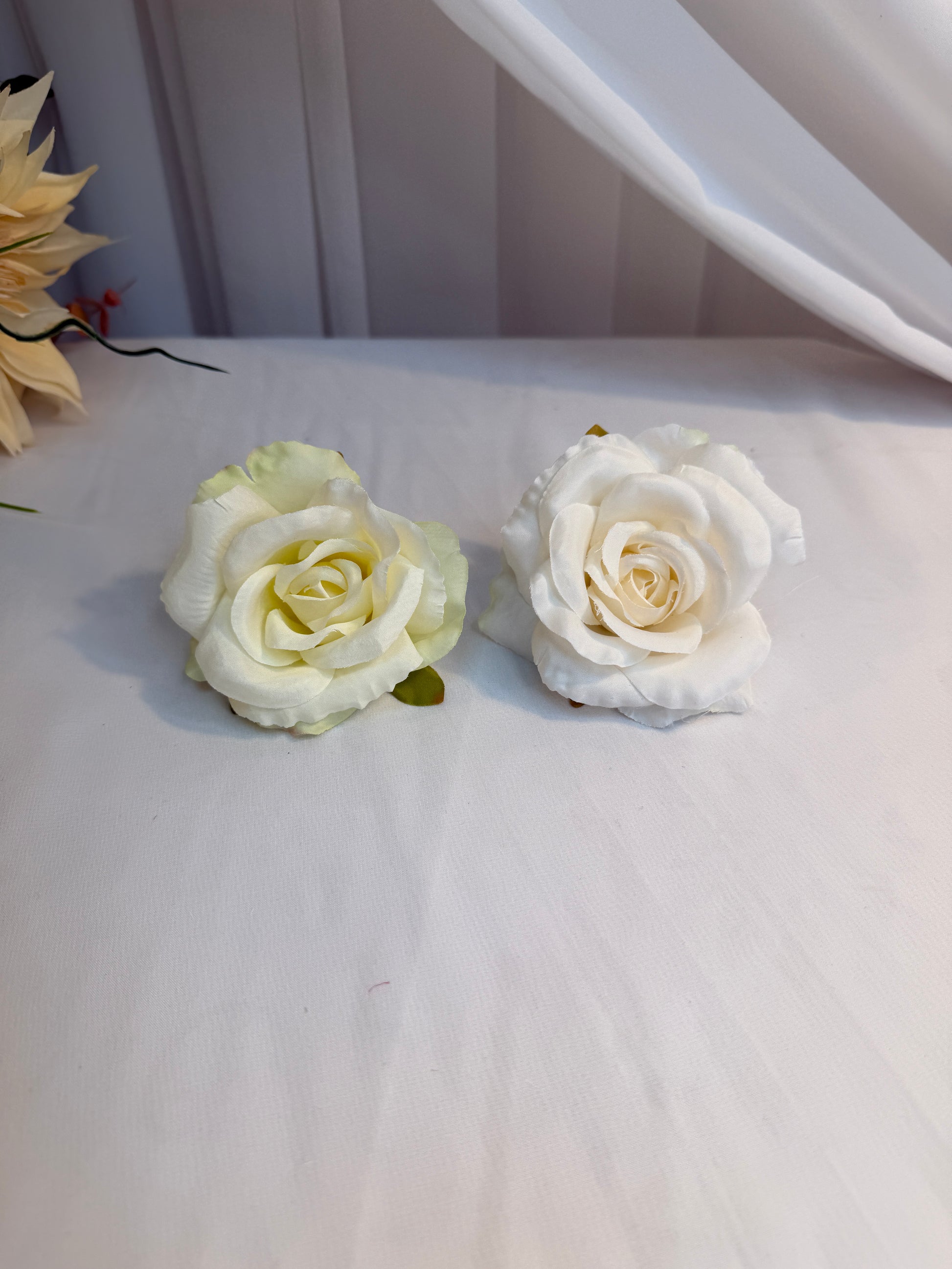 Capete de trandafiri din material textil. Diametrul unui cap este de 11cm si inaltimea de 5cm. Se folosesc in aranjamente florale. Se vand la punga de 30 bucati si fiecare punga are o singura culoare. Culoarea alb este usor ivoar.