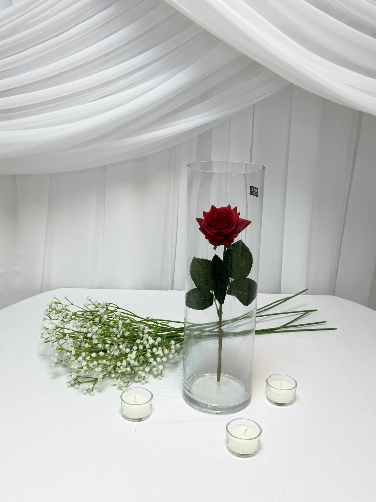 Vaza este realizată din sticlă transparentă de înaltă calitate și are o formă cilindrică modernă, perfectă pentru decoruri elegante și minimaliste. Cu un diametru de 8 cm, este disponibilă în patru variante de înălțime: 15 cm, 20 cm, 25 cm și 30 cm, oferind flexibilitate în realizarea diferitelor aranjamente.