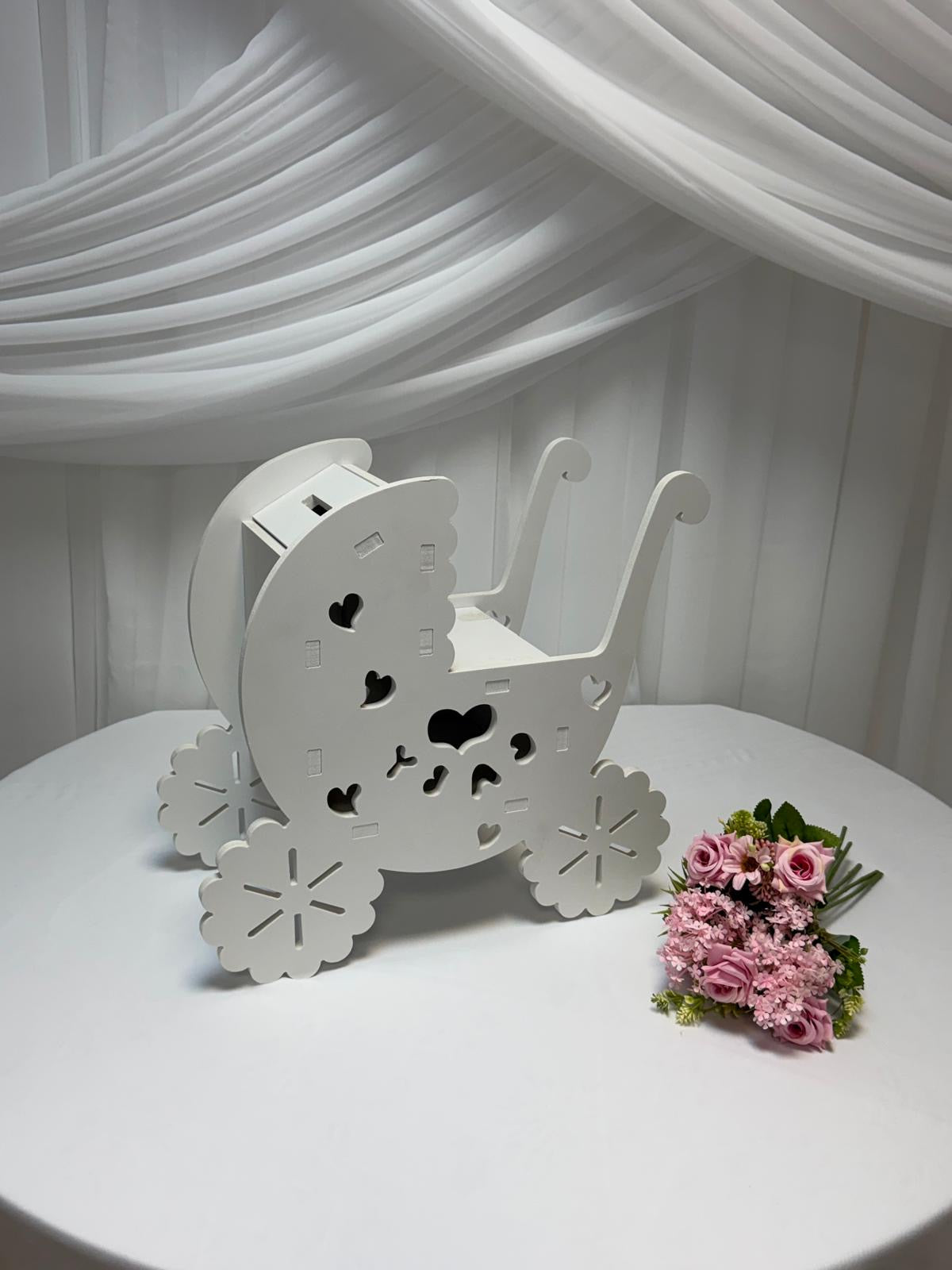 Casuta de bani din plastic alb perforata in forma de carucior are inaltimea de 39cm, latimea de 26 cm si lungimea de 37cm. Se folosesc la nunti si botezuri pentru plicurile cu dar.