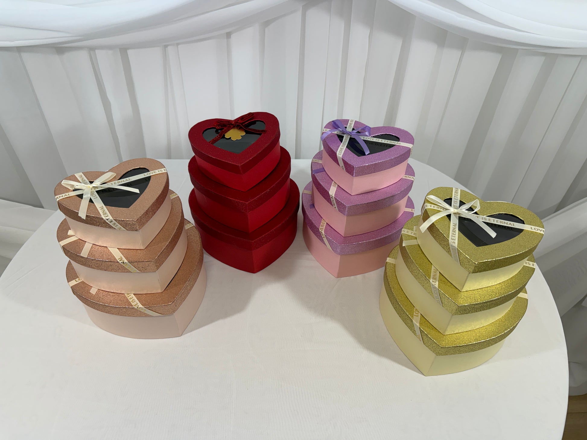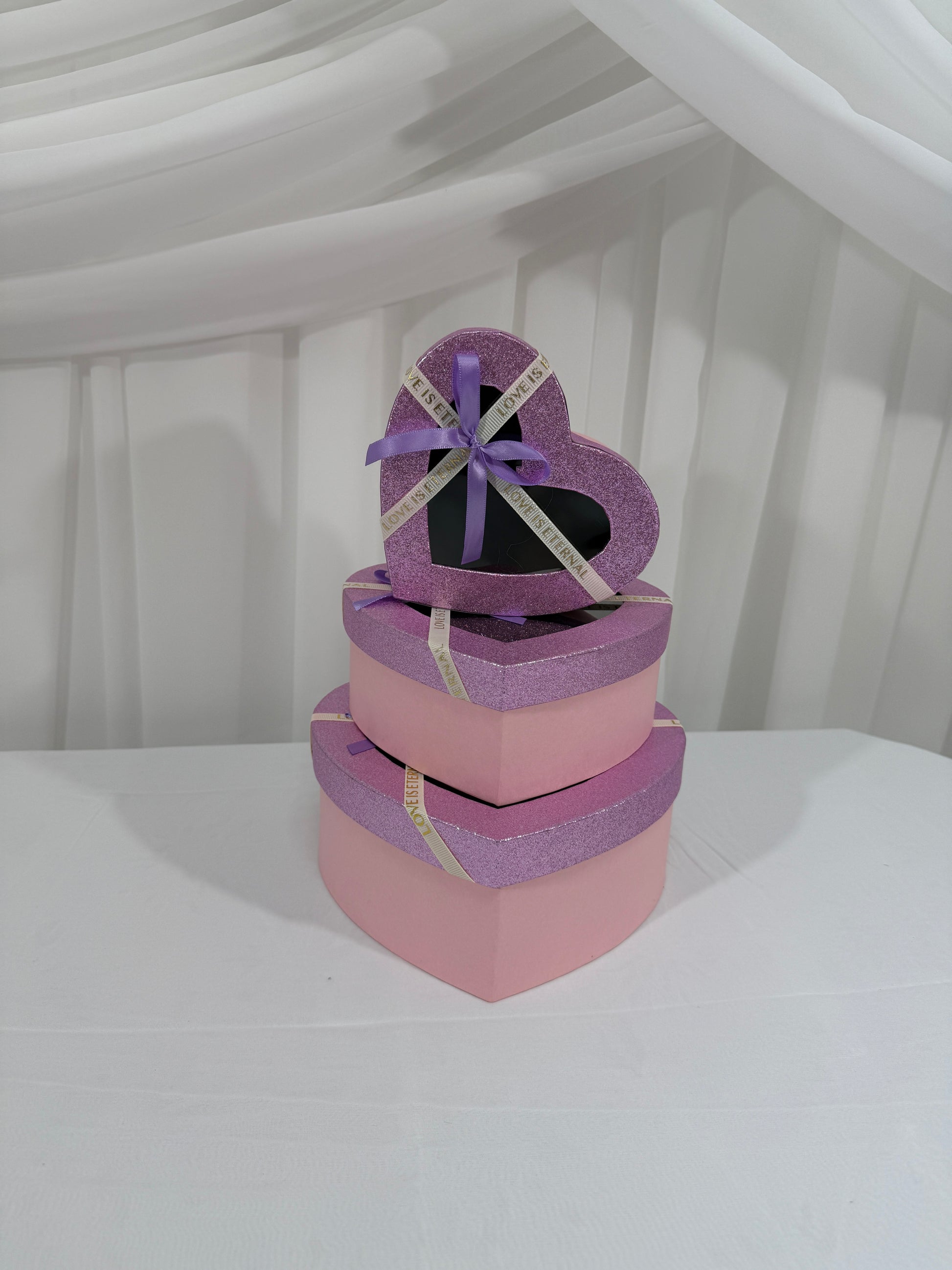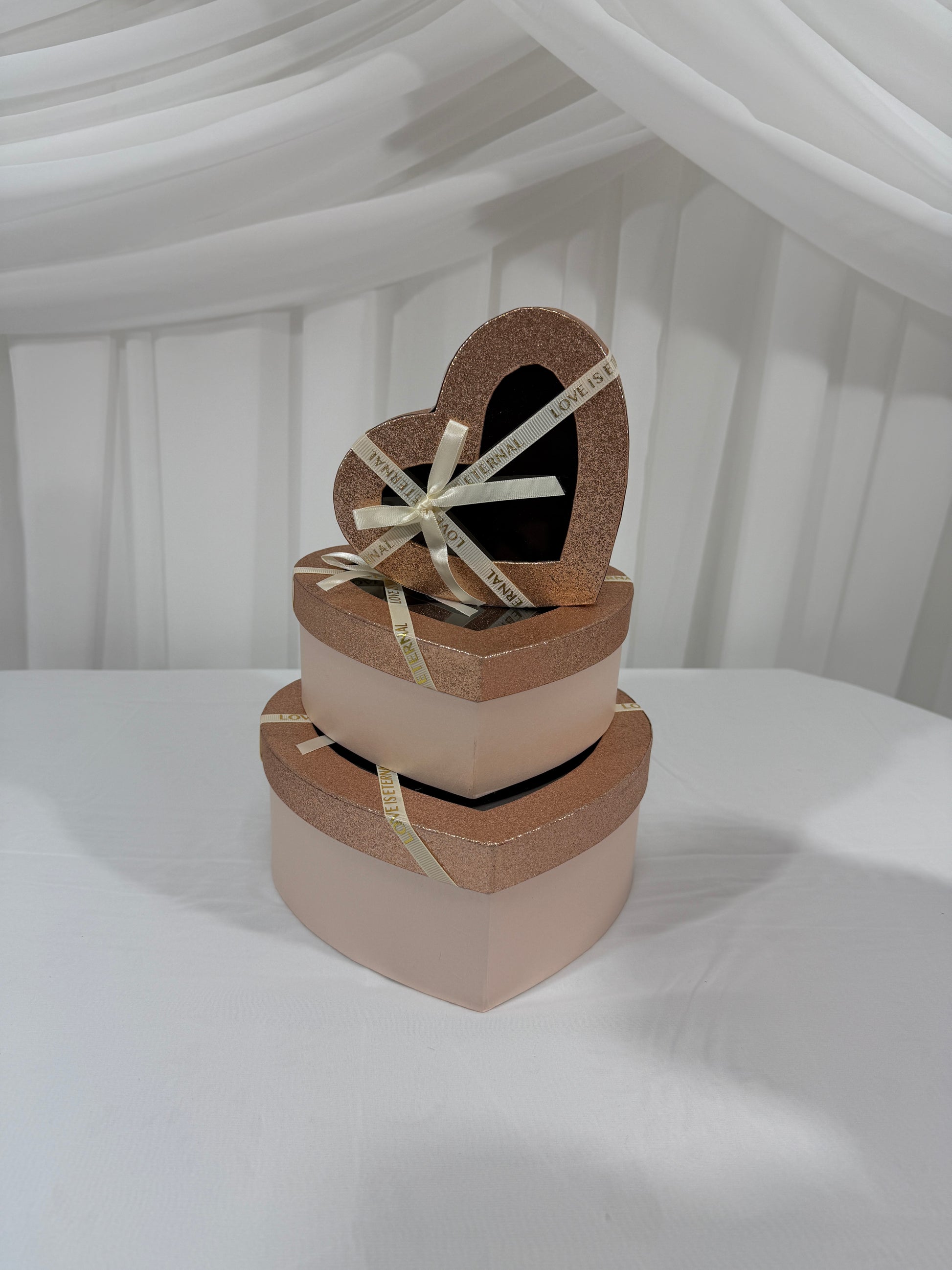 Cutii din carton în formă de inimă cu fereastră și capac cu sclipici – set 3 bucăți