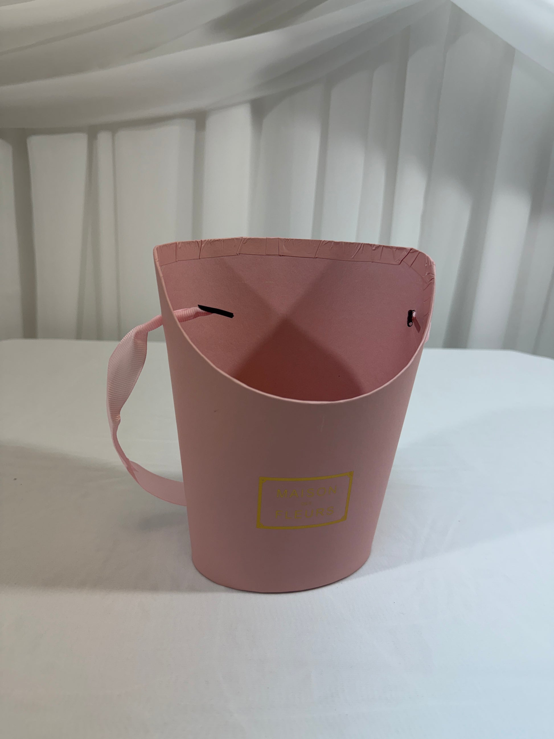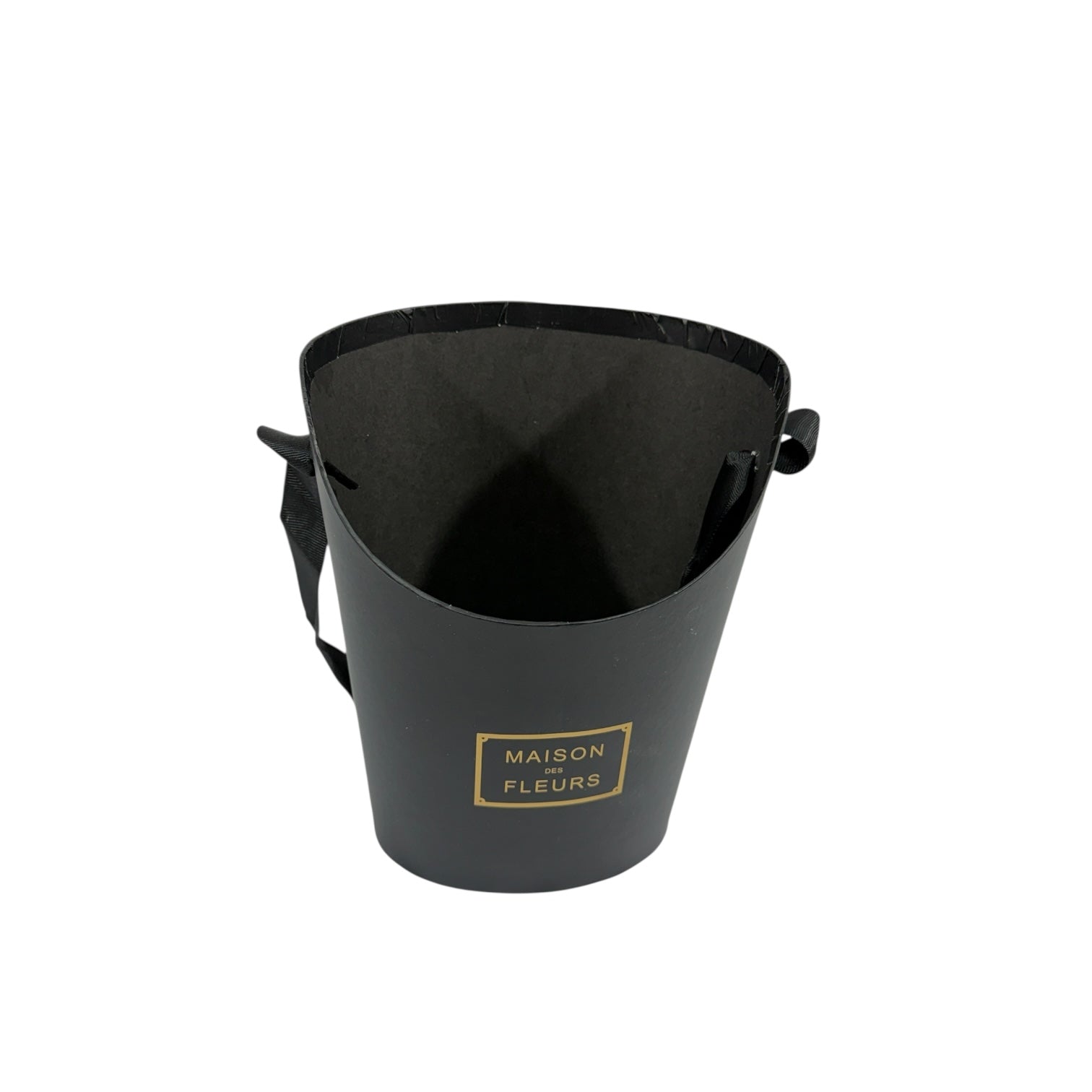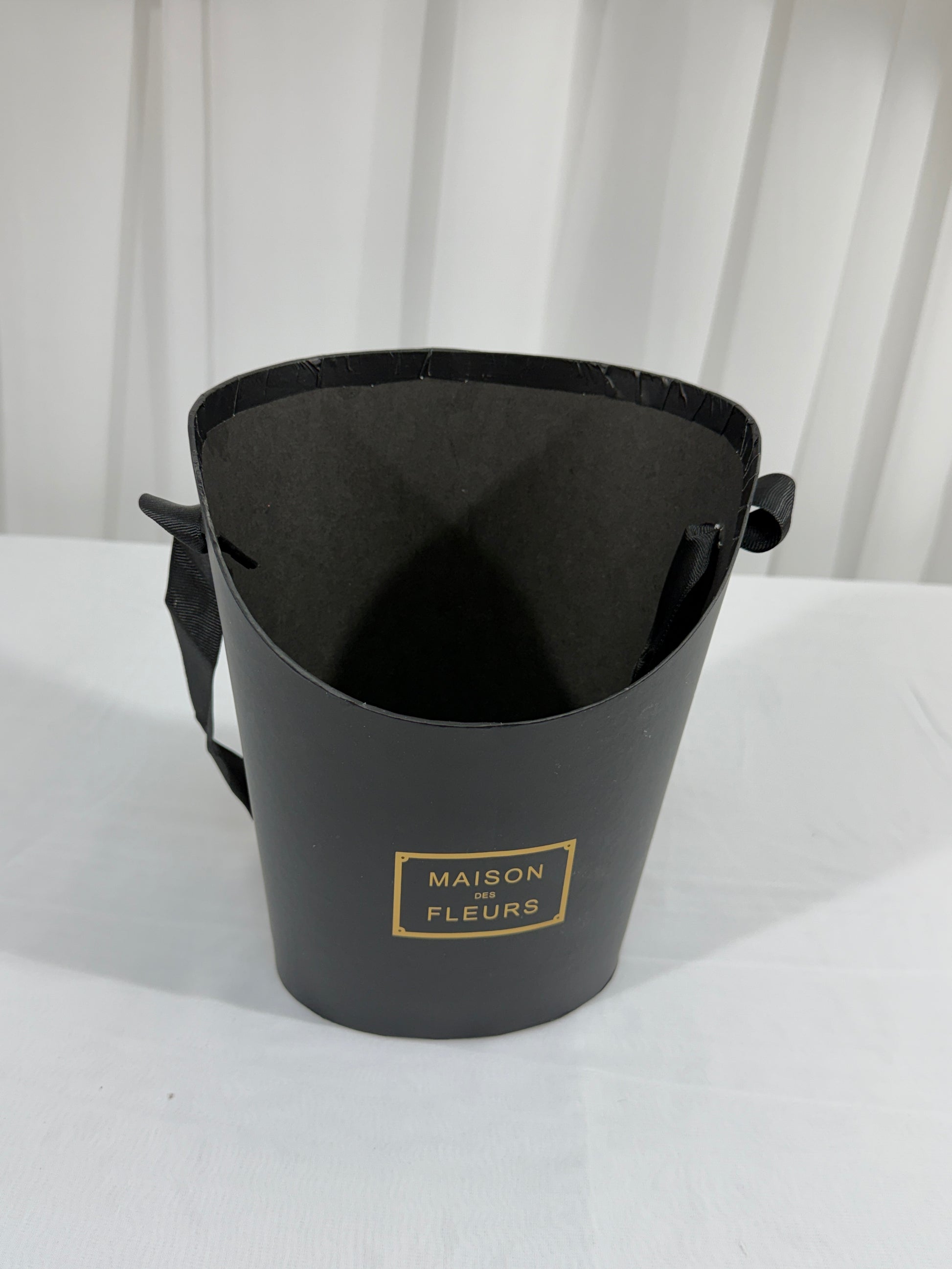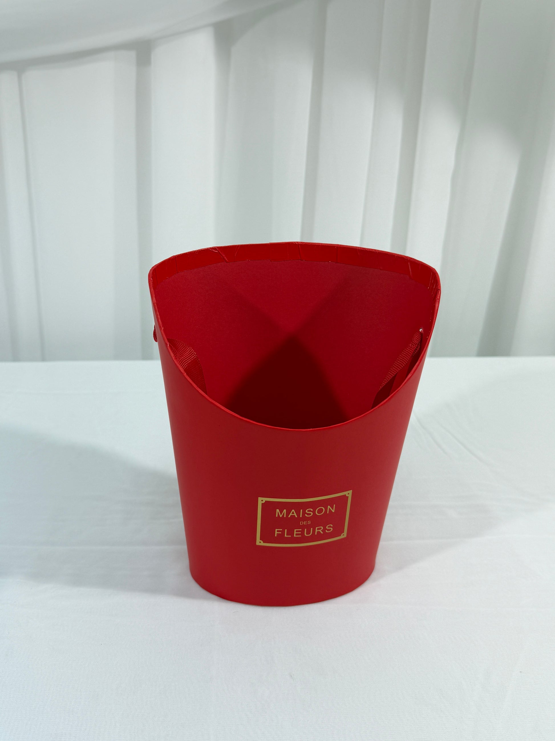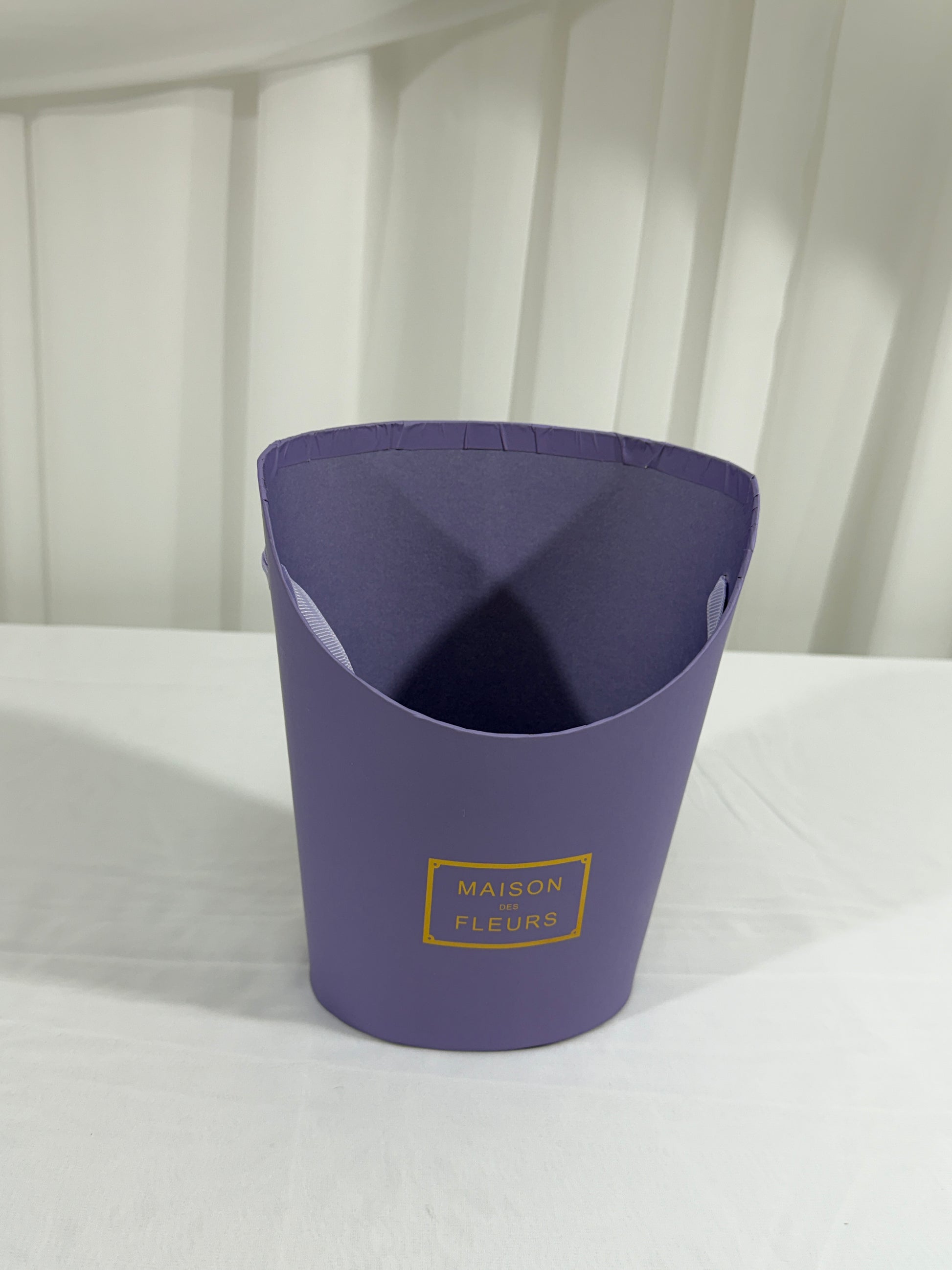 Cutia este realizată din carton rezistent, având o formă ovală elegantă și un decupaj în partea frontală, care oferă vizibilitate aranjamentului din interior. Este inscripționată cu „Maison Fleurs”, având un design rafinat și modern.