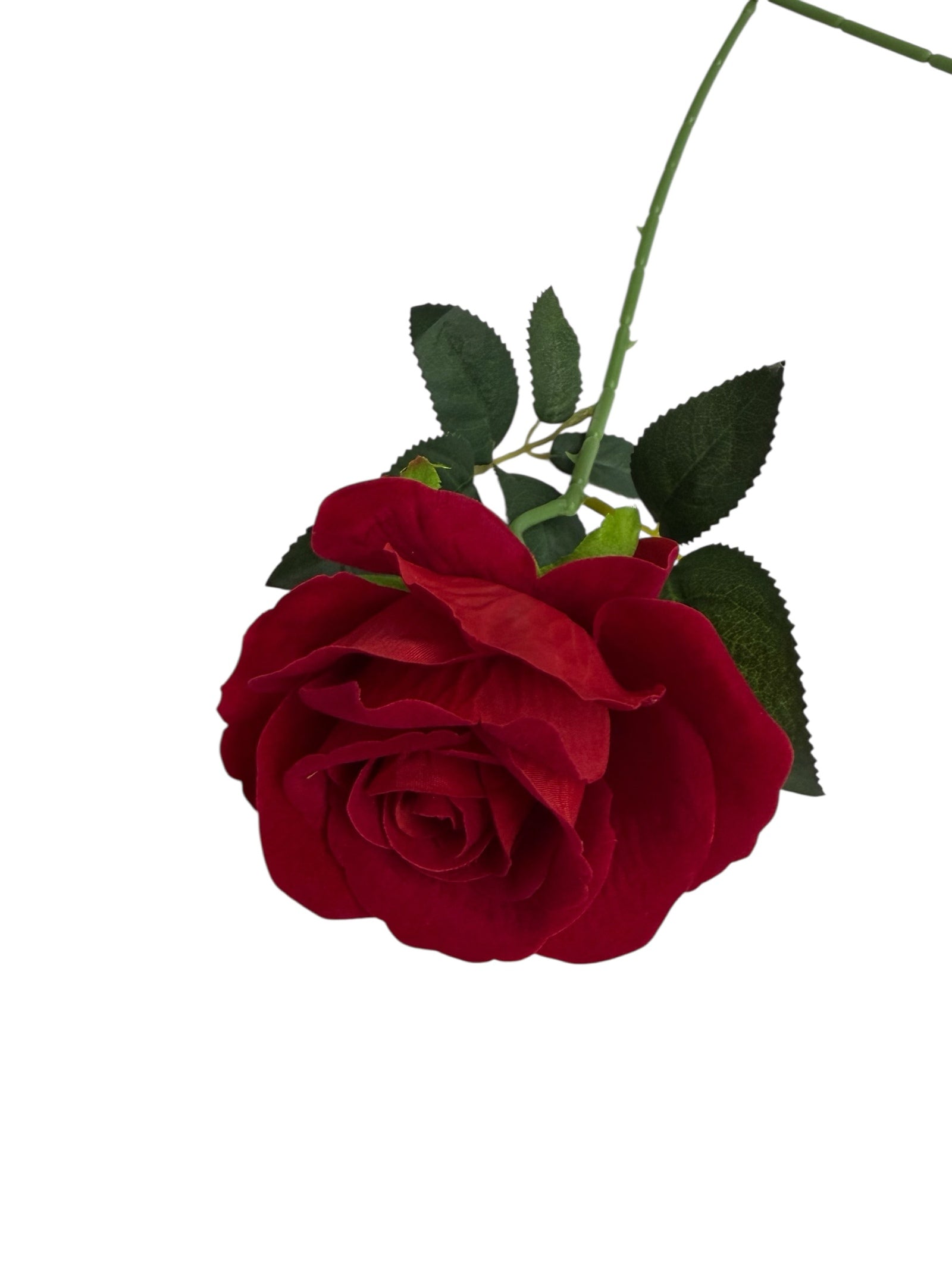 Trandafir decorativ din catifea, cu petale fine și aspect luxos, completat de frunze textile realiste.