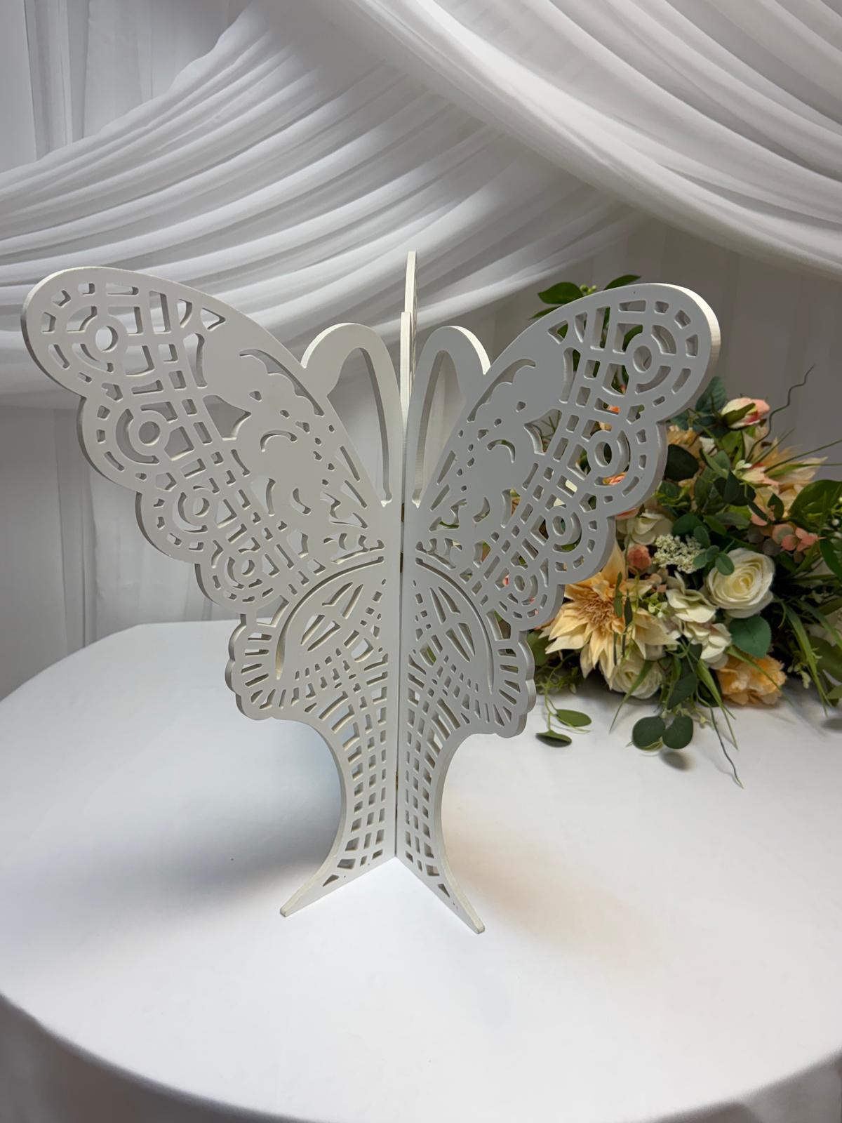 Fluture perforat din material PVC de culoare alba este un ornament folosit pentru decorarea salilor festive. Inaltimea unui fluture este de 50cm si diametrul de 60cm.
