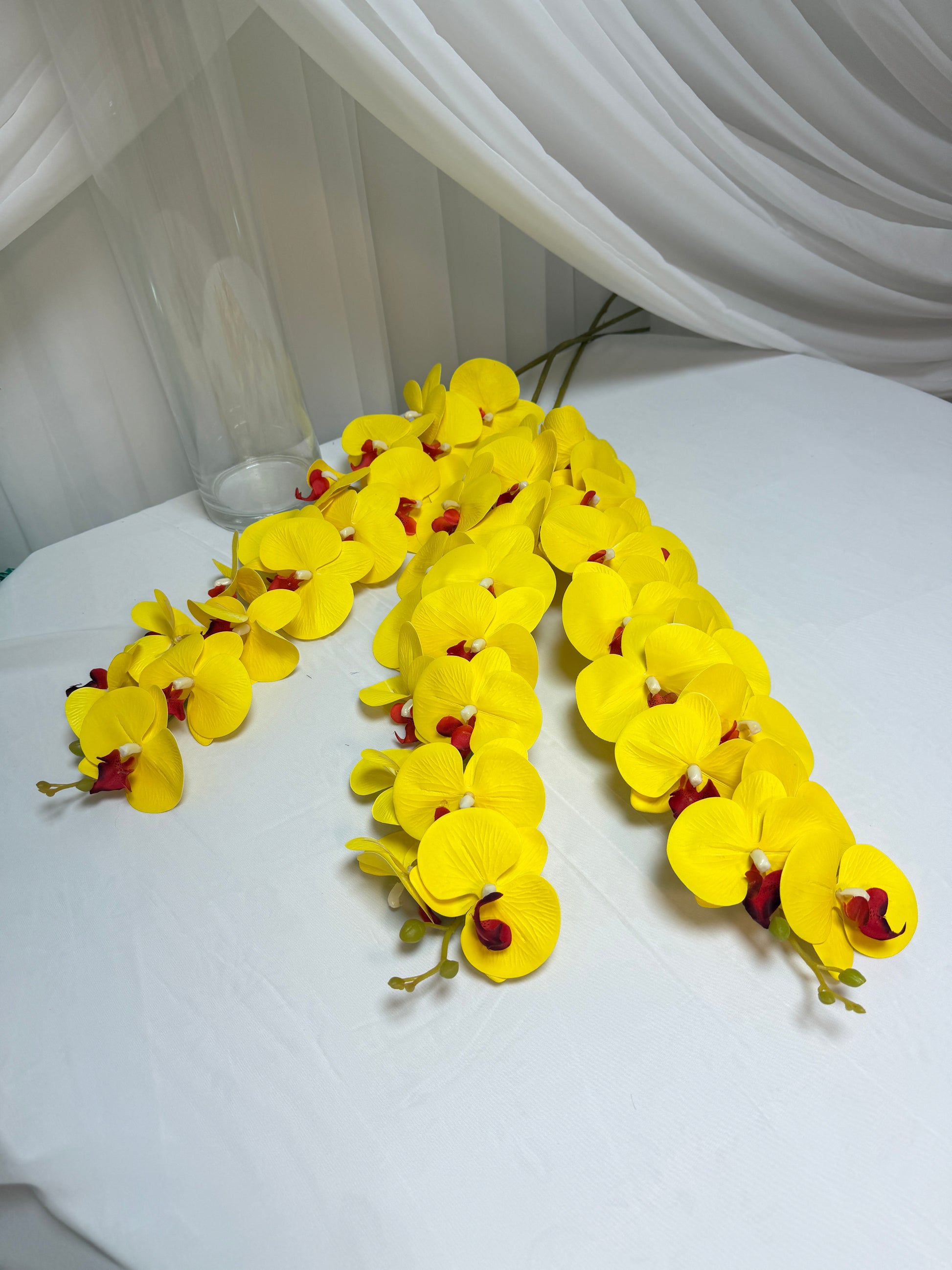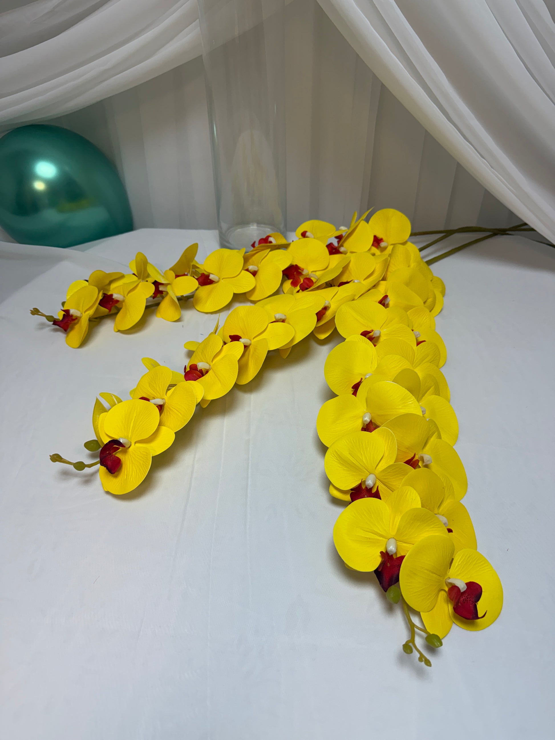 Firul de orhidee are tija din sarma imbracata in plastic si florile dintr-un material siliconat. Are 15 flori cu diametrul minim de 9,5cm si un diametru maxim de 11cm, lungimea totala 120cm, lungimea partii florale 60cm. Daca va plac orhideele tropicale, atunci aceasta decoratiune este tocmai ceea ce cautati. Florile, frumos colorate sunt ca vii si arata minunat pe o etajera, birou din locuinta. Se folosesc ca atare, dar si in aranjamente florale pentru decorarea salilor festive la nunti, botezuri si alte evenimente importante din viata dvs.