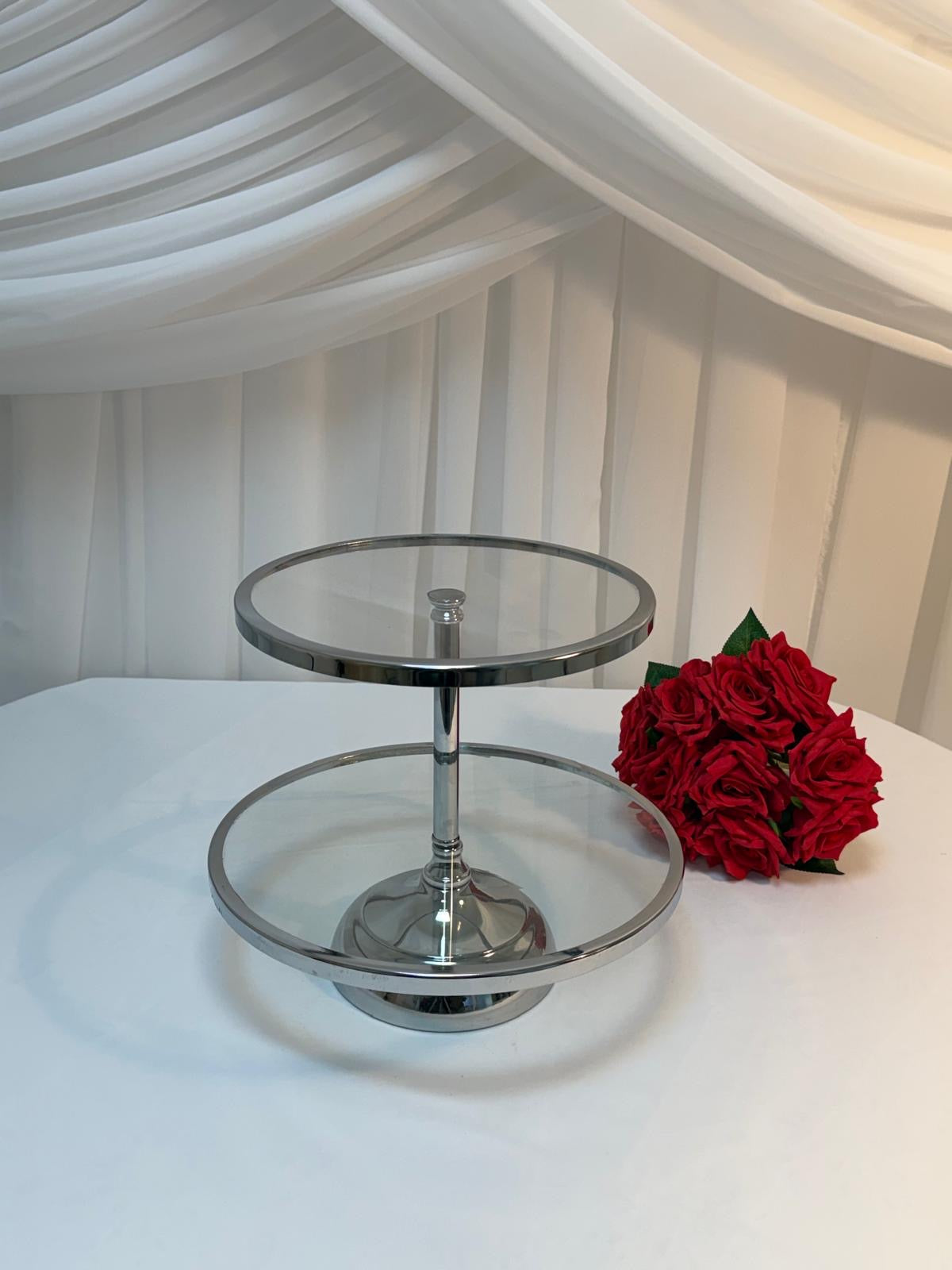 Platou din metal si sticla cu 2 etaje de culoare argintie pentru prajituri. Inaltimea platoului este de 24cm. Diametrul platoului cel mai mare este de 30cm si cel mai mic 25cm. Se foloseste pentru prajituri la nunti, botezuri si alte mese festive.