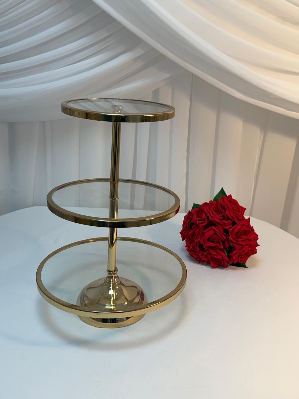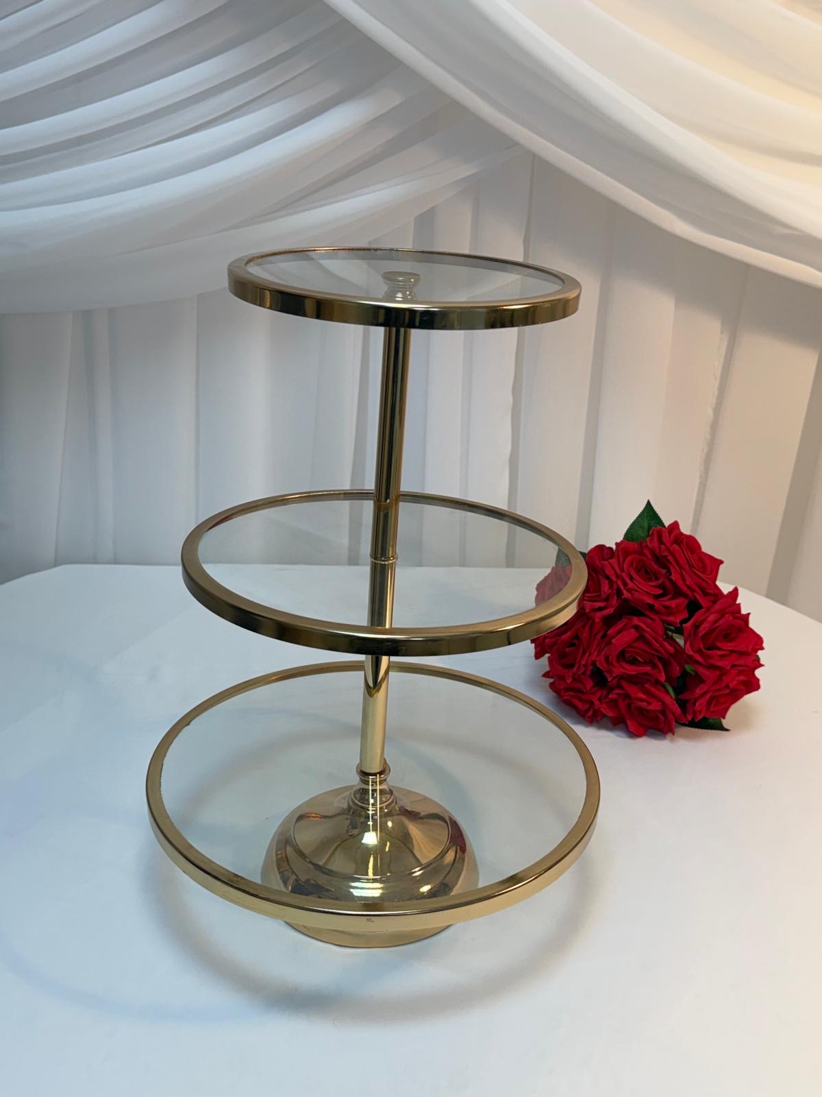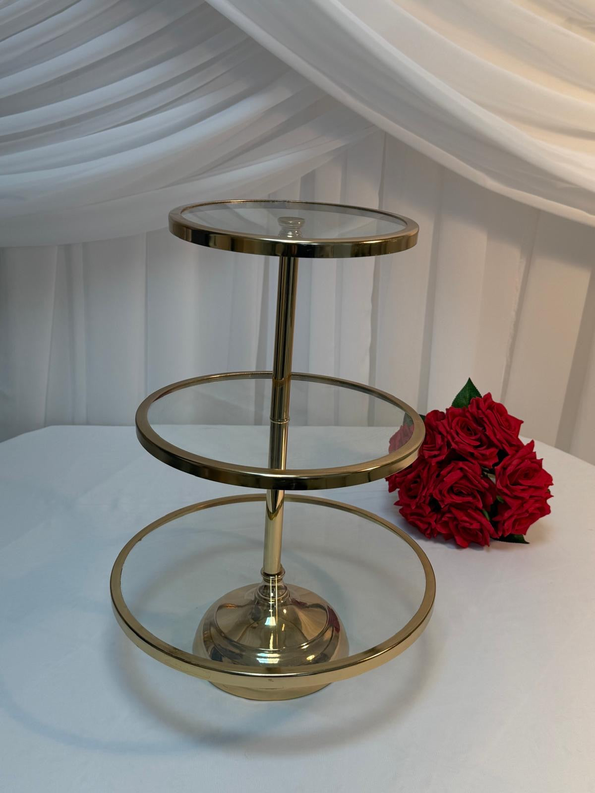 Platou din metal si sticla cu 3 etaje de culoare aurie pentru prajituri. Inaltimea platoului este de 40cm. Diametrul platoului cel mai mare este de 30cm, urmatorul 25cm si cel mai mic 20cm. Se foloseste pentru prajituri la nunti, botezuri si alte mese festive.