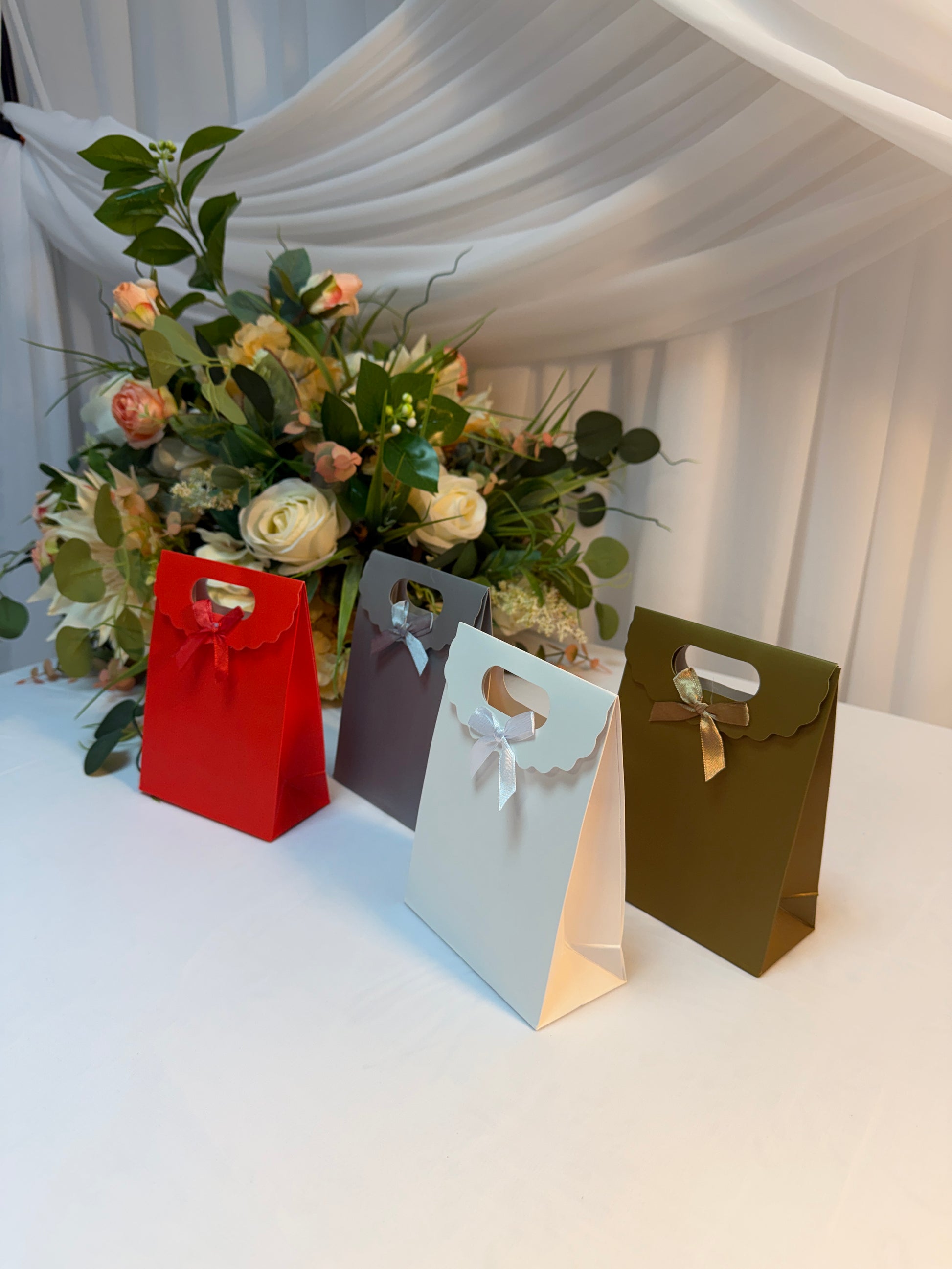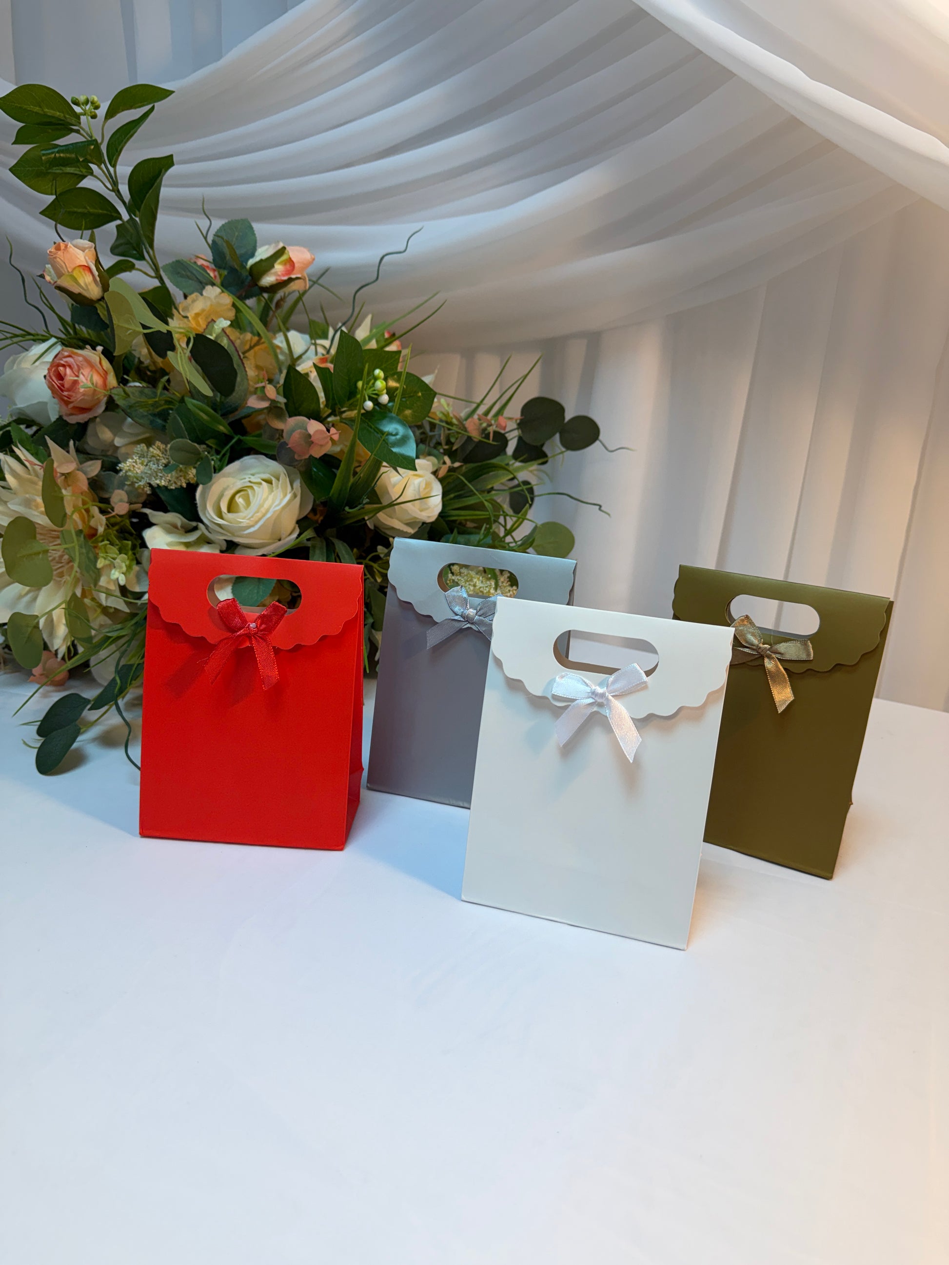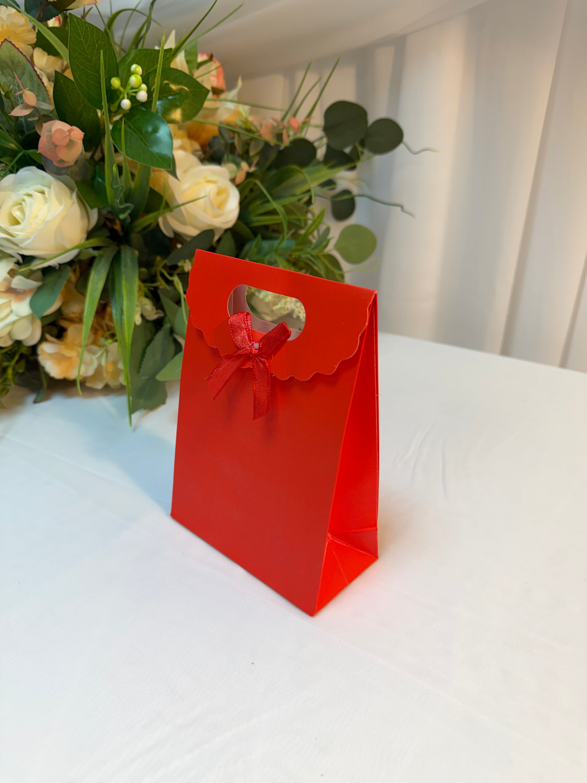 Pungi cadou din carton rigid, cu design elegant în formă de plic, ideale pentru ambalarea și prezentarea cadourilor. Disponibile în combinația clasică roșu, auriu, argintiu și alb, setul include 12 bucăți în patru dimensiuni variate: 7,5x4x10,5 cm, 12x6x6 cm, 19x9x27 cm și 24,5x12x31,5 cm. Materialul de calitate superioară asigură durabilitate și protecție optimă pentru articolele fragile. Perfecte pentru retail, evenimente speciale sau uz personal, aceste pungi combină funcționalitatea cu o prezentare sofisticată care elevează experiența de despachetare.
