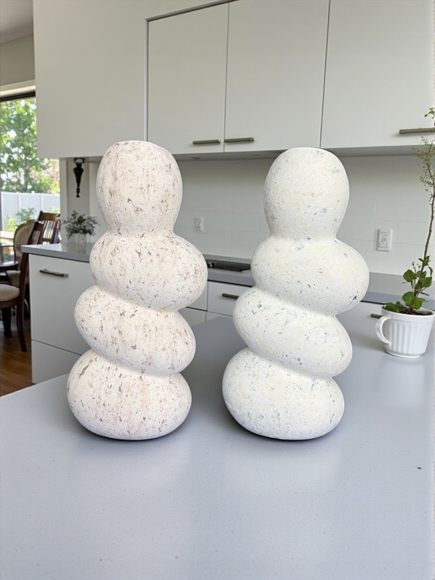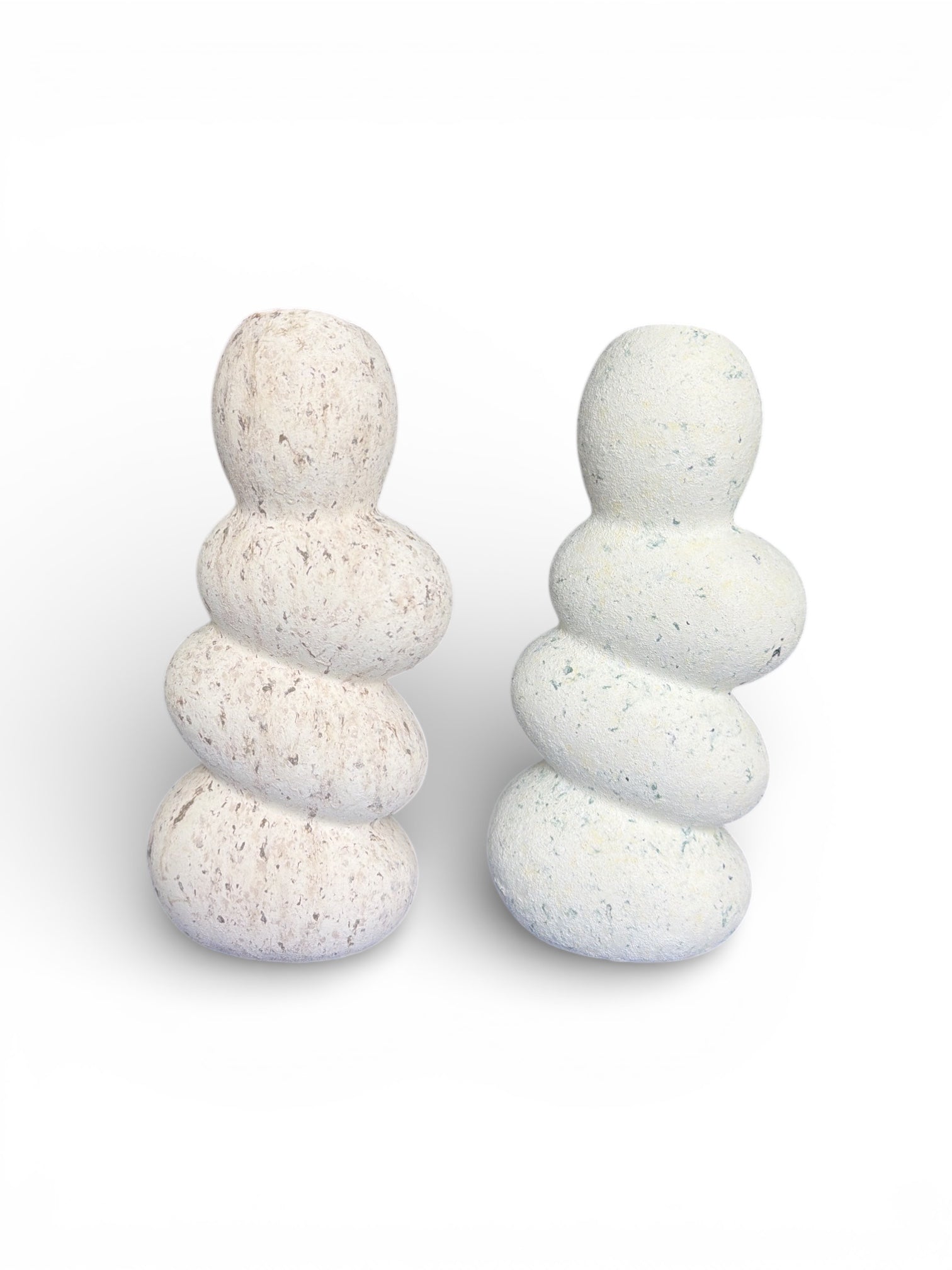 Această vază ceramică cu design sculptural este o piesă decorativă deosebită, inspirată din formele organice ale naturii. Alcătuită din patru forme rotunde suprapuse, asemănătoare unor pietre sau ouă stilizate, vaza impresionează prin aspectul său modern și echilibrat, aducând un plus de originalitate și rafinament oricărui spațiu interior.